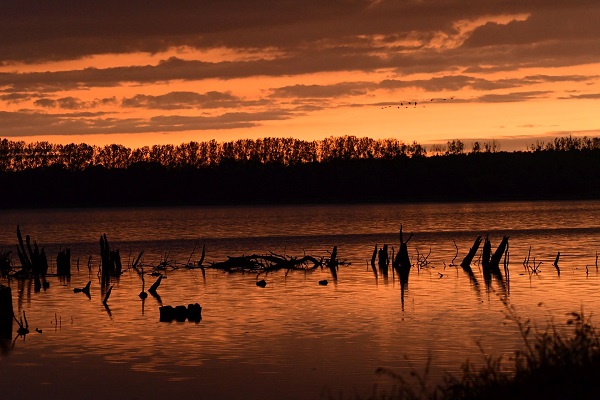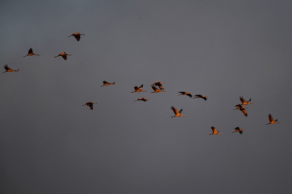 Umso eindrucksvoller wirkte es dann, wenn in den Abendstunden pünktlich zum Sonnenuntergang die Rufe von Tausenden und Abertausenden von Kranichen die Stille in diesem toten Wald „zerreißen“, während sie, von den Feldern und Wasserflächen im Umland kommend, über diesen hinweg fliegen, um gemeinsam in den Flachwasserbereichen des Sees zu übernachten. Insgesamt sieben Seeadler mit Jungtieren beim Jagen zu beobachten, war ebenfalls ein einmaliges Schauspiel.