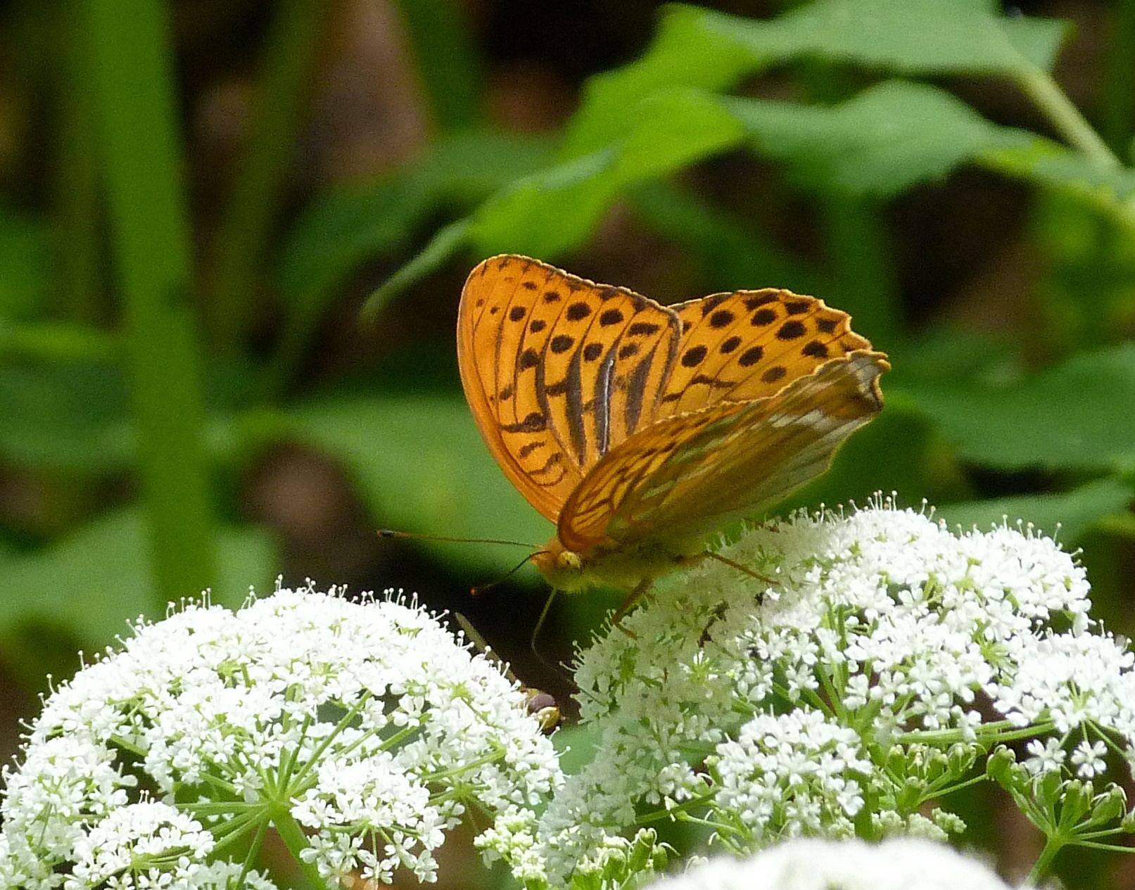 Am Wegesrand fielen zahlreiche „Herrengesellschaften“ des Kaisermantel-Falters (Argynnis paphia) auf, die tatsächlich überwiegend aus Männchen mit ihren gut sichtbaren Duftstreifen bestanden. Typische Ansammlungen von Raupen des Tagpfauenauges (Aglais io) labten sich an den unzähligen Brennesseln und immer wieder kreuzte ein Kleiner