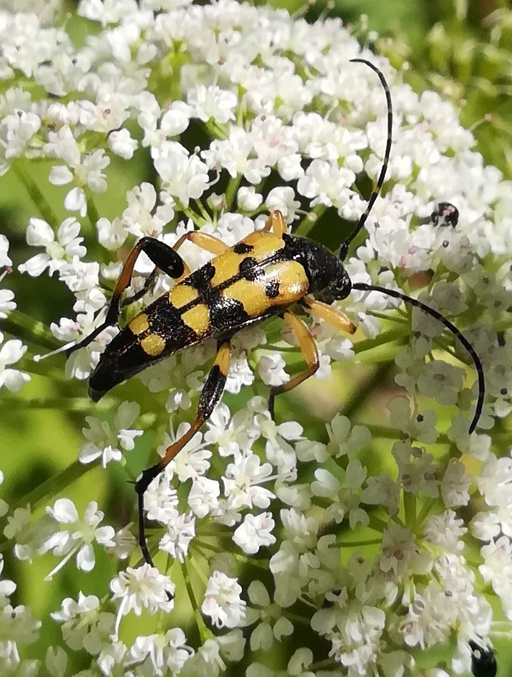 An Doldenblütlern bewunderten wir mit Gefleckten Schmalbock (Rutpela maculata) und Echtem Widderbock (Clytus arietis) zwei Käferarten, deren Larven sich in Totholz entwickeln.