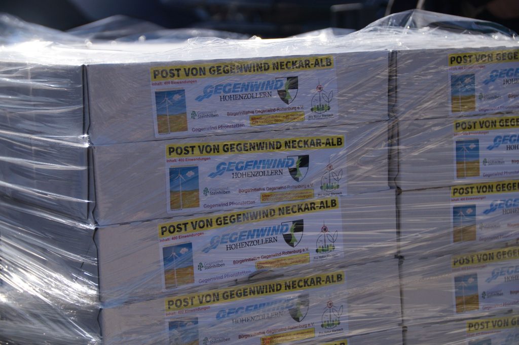 Die Schreiben wurden seit Beginn des Beteiligungsverfahrens im Januar innerhalb von drei Monaten gesammelt. Unter der Federführung der Bürgerinitiative „Gegenwind Hohenzollern“ hatte sich der Verbund „Gegenwind Neckar-Alb“ als Zusammenschluss von Bürgerinitiativen und Vereinen aus der Region gebildet.