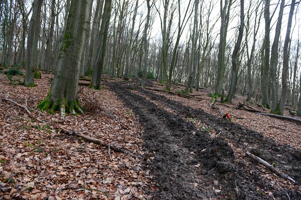 Bei einer solch nassen Wetterlage verbietet die „gute fachliche Praxis“ den Holzeinschlag mit schwerem Gerät. Aber auch hier ist eine Rücksichtslosigkeit offensichtlich. Wenn man die Holzmenge sieht, ahnt man, was mit dem Waldboden und dem Lebensraum Wald passiert. Die Holzpolder liegen im geschützten Buchenwald des FFH-Gebietes. Auch ein kulturhistorisch bedeutsamer Birkenwald wurde nicht verschont und für eine andere Nutzung durchforstet – obwohl der karge Boden dort kaum für Holzproduktion geeignet ist.