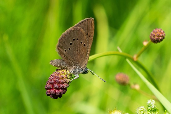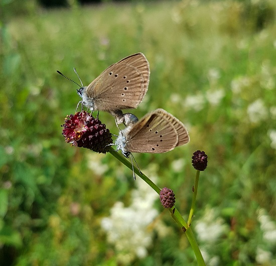Suche nach dem Dunklen und Hellen Wiesenknopf-Ameisenbläuling. Die Raupen ernähren sich in frühen Entwicklungsstadien ausschließlich von den Blütenköpfen des Großen Wiesenknopfs (Sanguisorba officinalis). Im Spätsommer werden sie u. a. von Rotgelben Knotenameisen in deren Nester getragen, wo sie überwintern und räuberisch von Ameisenbrut leben. Die Falter fliegen in einer Generation von Ende Juni bis Mitte August. Eine fachgerechte Mahd ist für das Überleben des Falters essenziell.