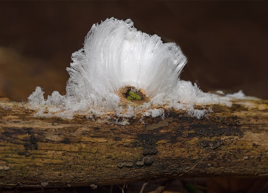 Im Jahre 1918 beschrieb der Forscher Alfred Wegener in der Zeitschrift „Die Naturwissenschaften“ eine recht merkwürdige Form gefrorenen Wassers, die sogenannte Eiswolle. Knapp 100 Jahre später konnte eine deutsche und Schweizer Gruppe um Diana Hofmann vom Forschungszentrum Jülich den Mechanismus erklären. Eine für Laubbäume typische Pilzart, die Rosagetönte Gallertkruste (Exediopsis effusa) scheidet ein proteinartiges Molekül ab, es wirkt als Kristallisationskeim, an dem sich die feinen Kristalle des Haareises bilden können. Im Gegensatz zu Reif und Rauhreif, bei denen nadelförmige Eiskristalle durch Sublimation unmittelbar aus dem Wasserdampf der Luft entstehen, bildet sich die mähnenartige Eiswolle aus flüssigem Wasser. Rauhreif lässt die Kristalle durch Anlagerung von außen wachsen, während Haareis wie lebendiges Haar von unten aus toten, morschen Laubbaumstücken heraus entsteht. Unter günstigen meteorologischen Bedingungen können auf diese Weise die hauchdünnen „Haare“ aus Eis bis zu einer Länge von zehn Zentimetern wachsen.