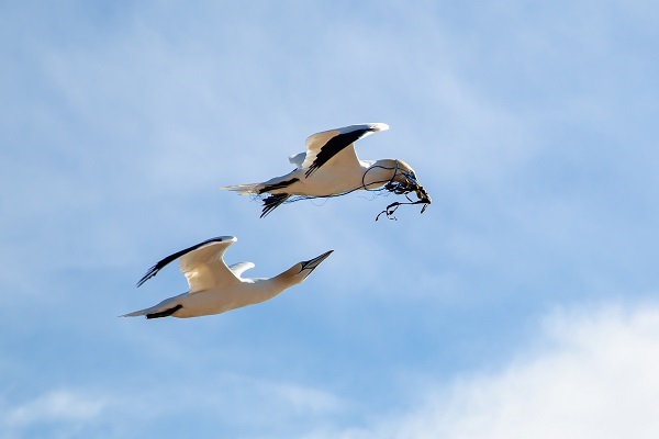 Basstölpel über Helgoland, welcher Teile von Fischernetzen als Nistmaterial zum Brutplatz fliegt – Foto: Marlies Becker / Seeadlerschutz Schlei e.V.