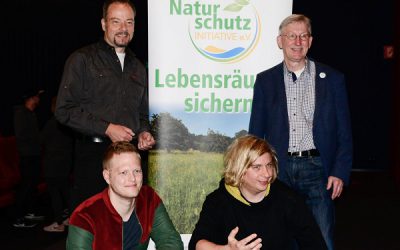 Foto: NI - v.l.n.r: Jan Haft, Regisseur und Kameramann, Nautilusfilm; Sebastian Schmidt und Dominik Eulberg, Komponisten der Filmmusik; Harry Neumann, Vorsitzender der Naturschutzinitiative e.V. (NI) und Moderator„Die Wiese - ein Paradies[...]