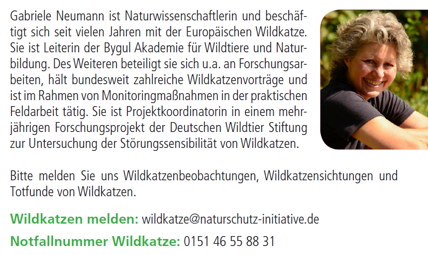 Die Europäische Wildkatze Die Broschüre „Die Europäische Wildkatze“, verfasst von Wildkatzenexpertin Gabriele Neumann, informiert Sie über den scheuen Waldbewohner, der nach wie vor auf der Roten Liste steht. Die Wildkatze braucht unser aller Schutz.“ unter: bestellung[at]naturschutz-initiative.de