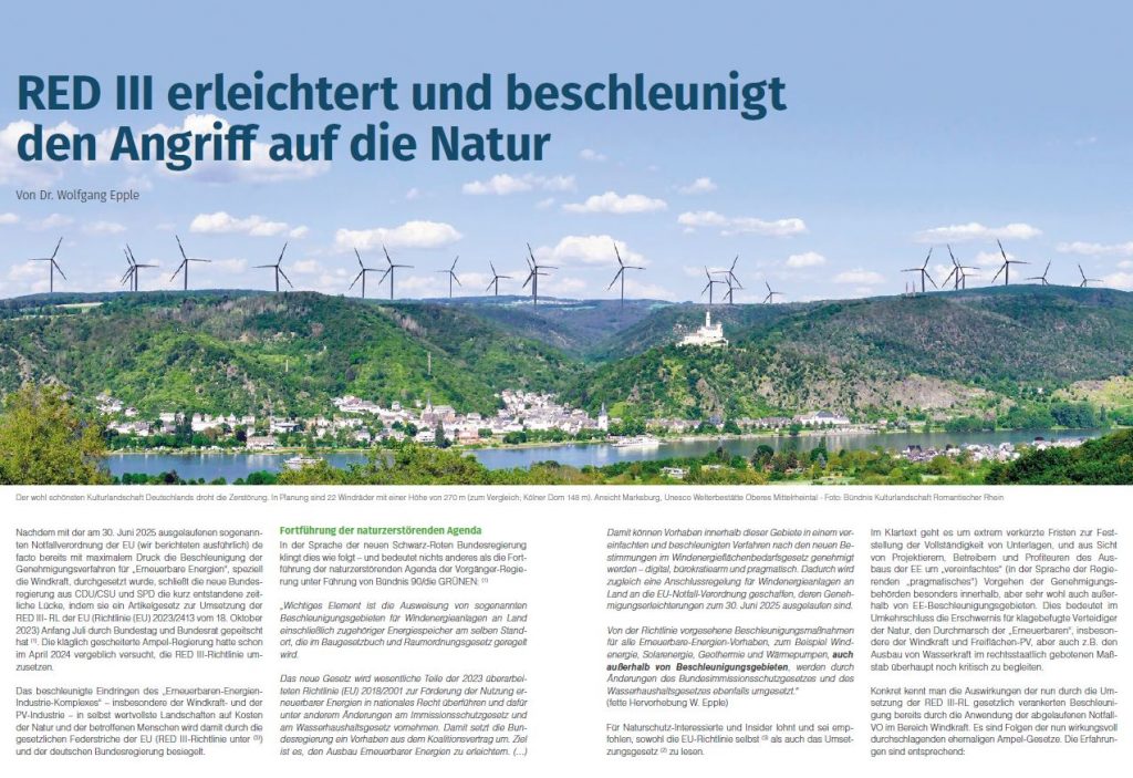 Die Notfallverordnung der EU hatte bereits mit maximalem Druck die Beschleunigung der Genehmigungsverfahren für Erneuerbare Energien, speziell die Windkraft, durchgesetzt. Nun folgt die neue Bundesregierung von CDU/CSU und SPD mit einem Gesetz zur Umsetzung der RED III-Richtlinie der EU, das sie durch Bundestag und Bundesrat gepeitscht hat.
