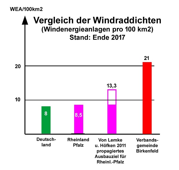Der in der Folge einsetzende Windrad-Wildwuchs hat, zum Schaden von Natur und Landschaft, das Obere Nahebergland mit so vielen Windrädern überzogen, dass der Forderung nach „substanziell Raum für die Windkraft“ längst mehr als Genüge getan ist. Mit 45 gebauten bzw. genehmigten Anlagen, wird in der Verbandsgemeinde Birkenfeld eine Windraddichte von 21 Windrädern auf 100 km2 erreicht. Die durchschnittliche Windraddichte in Deutschland beträgt 8 WEA auf 100 km2, in Rheinland-Pfalz 8,5 auf 100 km2. Das hochgesteckte Ausbauziel der rot-grünen Landesregierung von 2010 lag bei 2650 WEA für unser Bundesland. Das entspräche einer Dichte von 13,3 WEA auf 100 km2. Selbst diese, manchem utopisch erscheinende Dichte, ist in unserer Verbandsgemeinde längst und deutlich überschritten!