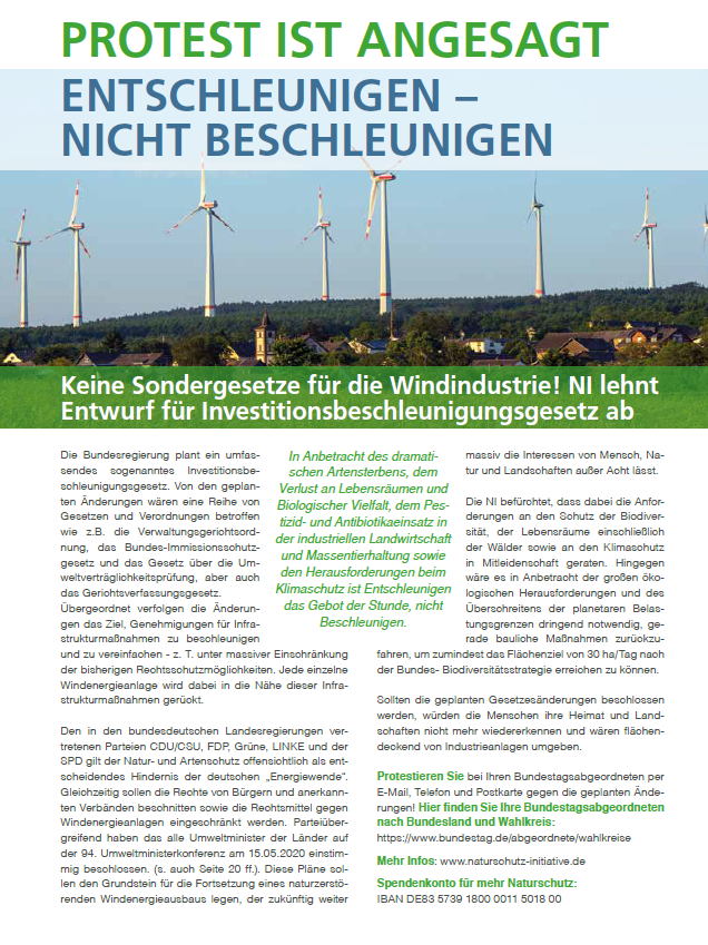 Wir fordern die Bürgerinnen und Bürger auf, bei Ihren Bundestagsabgeordneten, dem Bundesumwelt- und Bundeswirtschaftsministerium per Email, Telefon, Telefax oder Postkarte gegen die geplanten Änderungen im sogenannten Investitionsbeschleunigungsgesetz zu protestieren. Denn dieser Gesetzentwurf stellt einen Angriff auf den Naturschutz und die demokratischen Beteiligungsmöglichkeiten von Bürgern und Verbänden dar“, so Harry Neumann und Dr. Ulrich Althauser.