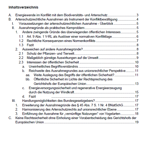 Windenergieanlagen, die von den zuständigen Behörden genehmigt werden, obwohl diese das Tötungsrisiko für Vögel der europäischen Arten in signifikanter Weise erhöhen, erhebliche Störungen der Individuen hervorrufen oder zur Schädigung geschützter Niststätten führen, sind aufgrund der restriktiven Auslegung des Art. 9 der Vogelschutz-Richtlinie 2009/147/EG durch den EuGH mit dem Unionsrecht nicht vereinbar, so das Ergebnis des Gutachtens.
