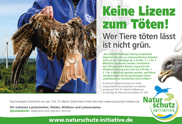 Nachdem sich die 94. Umweltministerkonferenz (UMK) dafür aussprach, den Betreibern von Windenergieanlagen im Konfliktfall unter bestimmten Bedingungen die „Lizenz zum Töten“ heimischer Greifvögel zu erteilen, beauftragte die NI das jetzt vorliegende Rechtsgutachten.