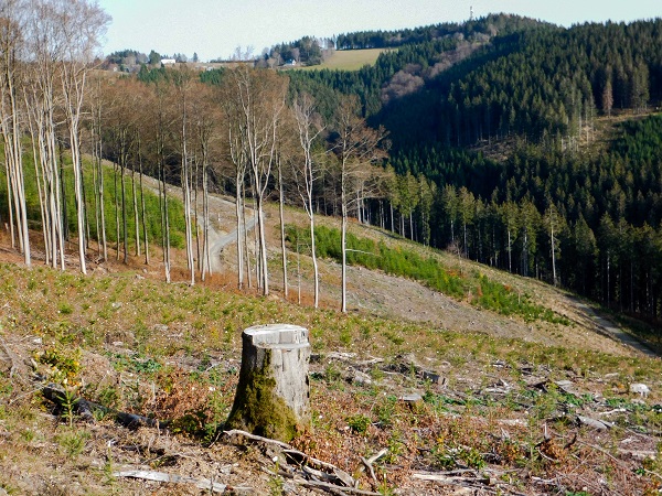 Auf einer Waldfläche bei Schmallenberg (Hochsauerland) wurde in den letzten Jahren schrittweise ein etwa 30 Hektar großer, mehr als 100-jähriger Buchenbestand kahlgeschlagen und die Fläche anschließend mit Fichten aufgeforstet.