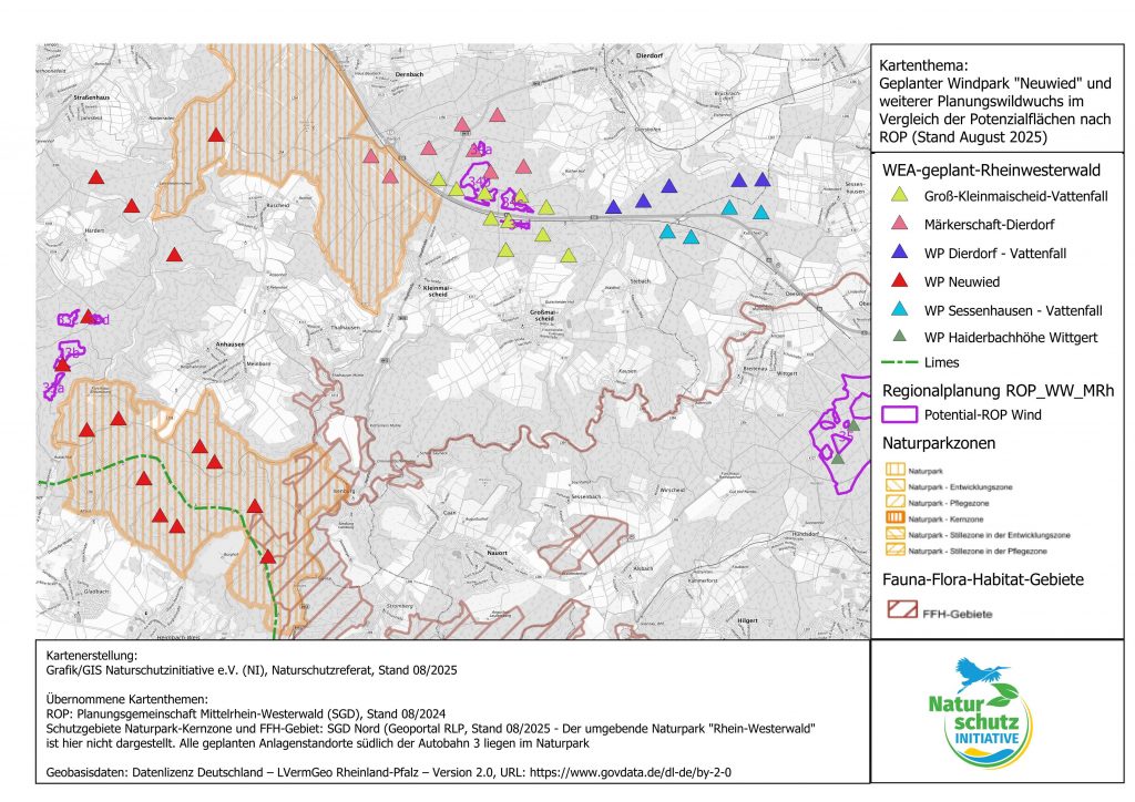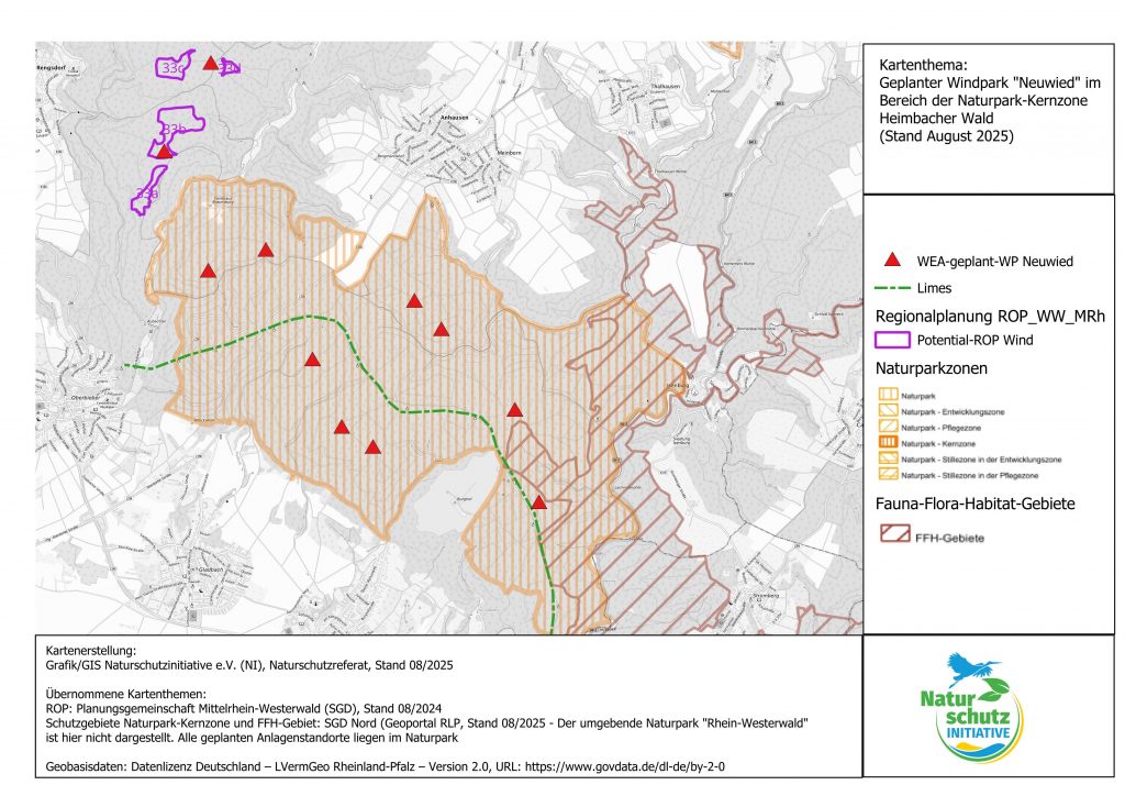 Die Naturschutzinitiative e. V. (NI) kritisiert die Planungen der Stadt Neuwied, entlang der Kernzonen des Naturparks Rhein-Westerwald und der FFH-Gebiete "Wälder zwischen Linz und Neuwied" sowie "Felsentäler der Wied" sechs Windkraftanlagen errichten zu wollen.