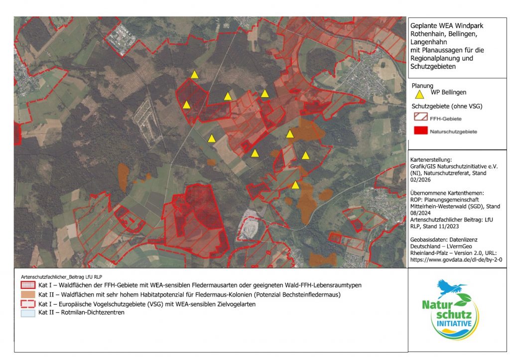 Harry Neumann, Landes- und Bundesvorsitzender der NI beklagt in besonderem Maße den derzeitigen Planungswildwuchs. „Während das Land über ein Fachbeitrag des Landesamtes für Umwelt Rheinland-Pfalz (LfU) für die laufende Fortschreibung der Regionalen Raumordnungspläne eine Kulisse entwickelte, wo einerseits der Erhalt windkraft-empfindlicher Arten Vorrang haben soll und im Gegenzug wo woanders Windkraft einen Vorrang haben soll, hält sich die Planung auf kommunaler Ebene nicht daran, weil der Regionalplanung bei der Windkraft die Verbindlichkeit fehlt“. Beim kritisierten Windpark steht keine WIA in einem Bereich, der als Vorranggebiet für Windkraft ausgewiesen werden soll.