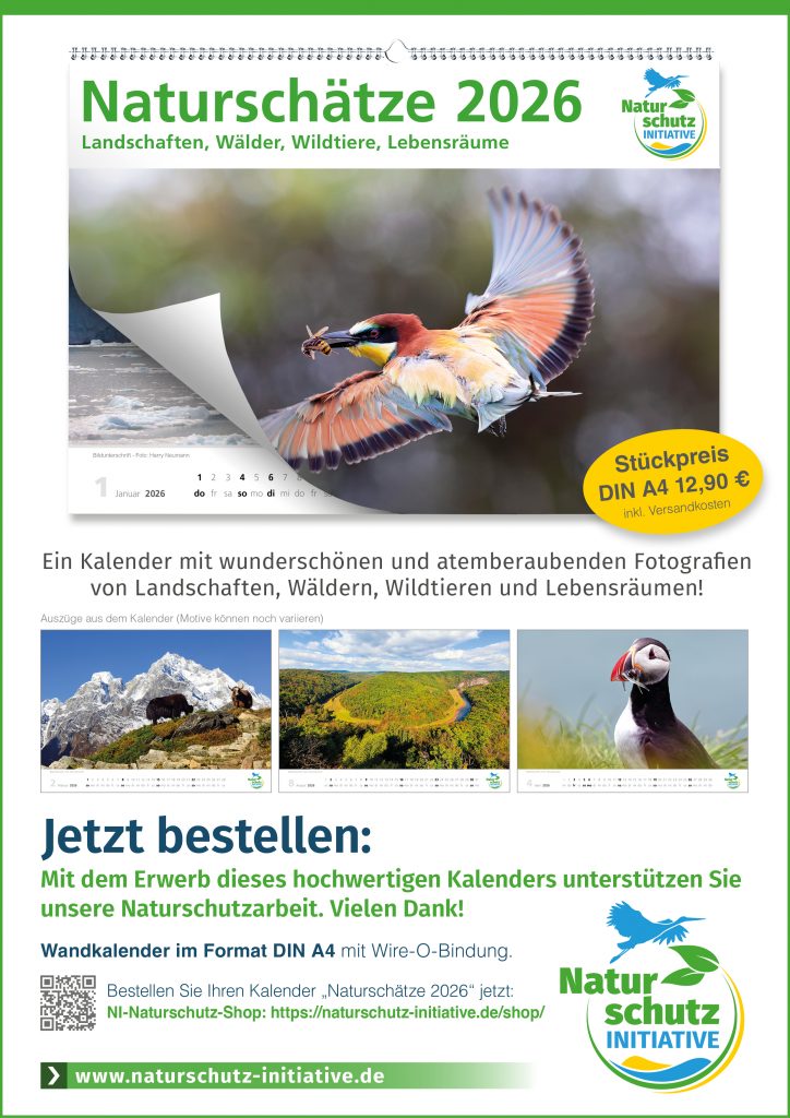 Unser Kalender „Naturschätze 2026“ mit wunderschönen und atemberaubenden Fotografien von Landschaften, Wäldern, Wildtieren und Lebensräumen ist ab sofort lieferbar! Er ist ein täglicher Blickfang der Freude bereitet und Sie durch das Jahr begleitet! Tauchen Sie ein in die faszinierende Welt der Natur!