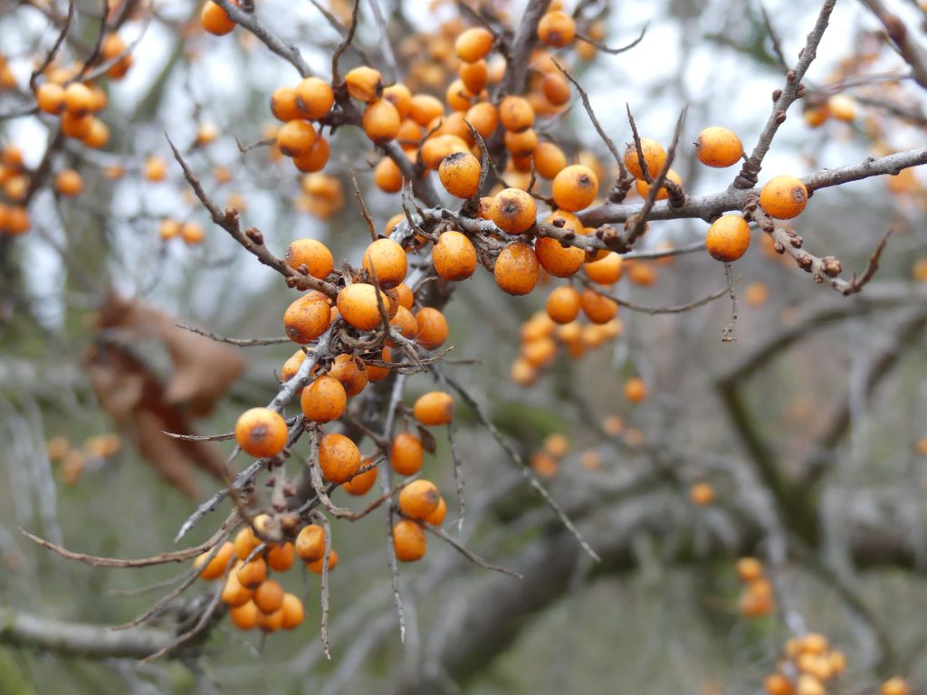Als so genannter Wintersteher, also als eine Pflanze, deren Früchte oder Samen bis in den Winter oder länger am Ast haften bleiben, bietet er zahlreichen Vögeln eine zuverlässige Nahrungsquelle. Häufig beobachte ich große Scharen von Wacholderdrosseln, die von den Früchten gar nicht genug bekommen können. Die Vogelwelt ist ein großer Verbündeter des Sanddorns – und umgekehrt. Im Austausch für Nahrung, Schutz und Lebensraum leisten die Vögel treue Dienste als Geburtshelfer. Durch ihre Ausscheidungen sorgen sie für eine weite Verbreitung der vorverdauten Samen.